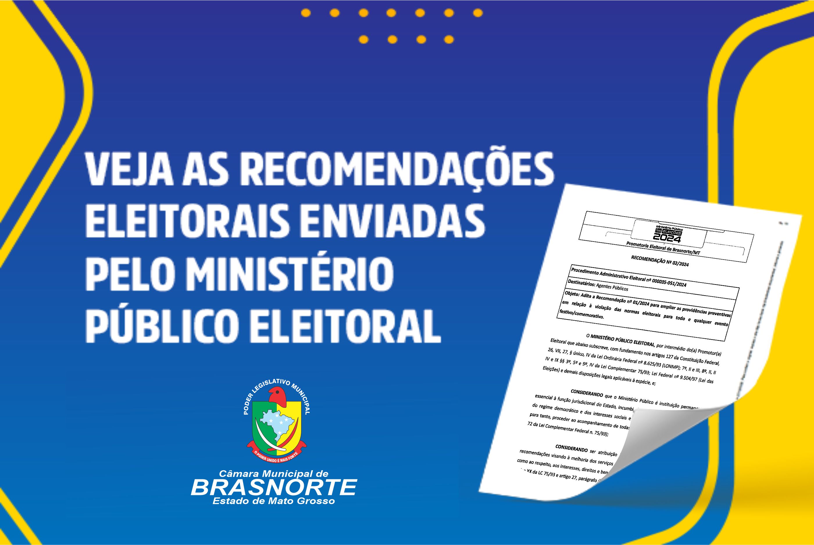 A Câmara Municipal de Brasnorte informa que a Recomendação nº 02/2024, emitida pelo Ministério Público, Promotoria Eleitoral de Brasnorte - Mato Grosso, acatada pelo Poder Legislativo e já está disponível para consulta em nosso site.