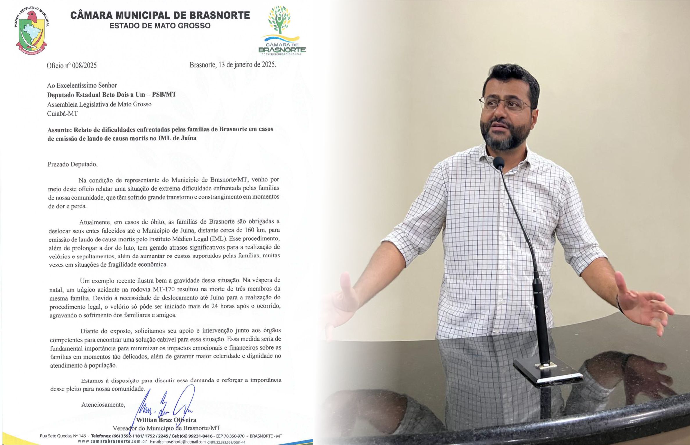 O vereador Willian Braz - UB, tem buscado apoio de deputados estaduais para solucionar uma questão que aflige a comunidade local em momentos de grande fragilidade. Atualmente, as famílias do município enfrentam enormes dificuldades sempre que ocorre um óbito, devido à necessidade de deslocamento até Juína, a aproximadamente 160 km de distância, para emissão de laudo de causa mortis pelo Instituto Médico Legal (IML).