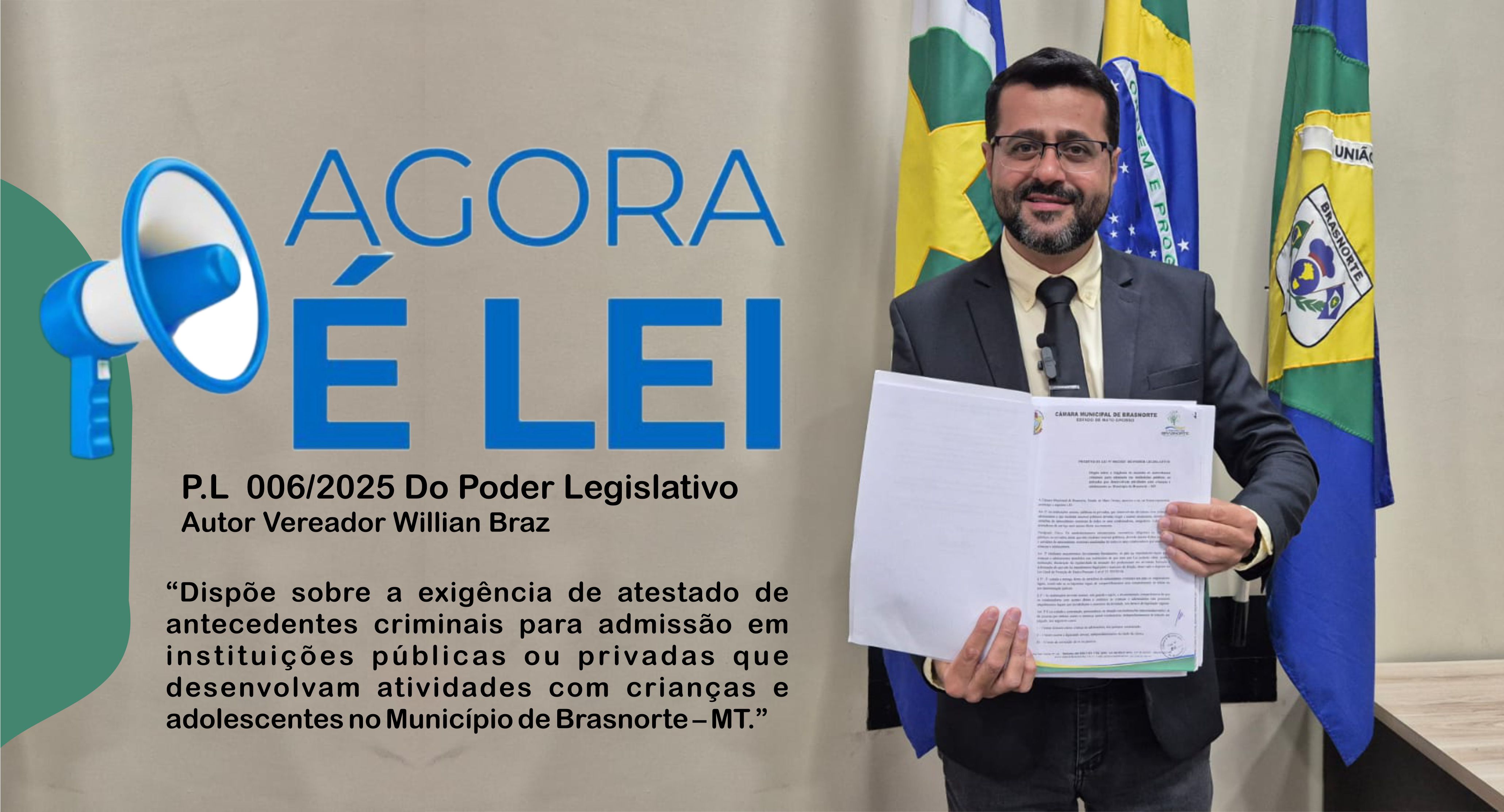 Ao promulgar a lei, o vereador destacou: “Nosso compromisso é garantir que as crianças e adolescentes de Brasnorte estejam sempre em ambientes seguros, onde possam aprender, se desenvolver e crescer livres de riscos. Esse é um marco na proteção da infância e da juventude em nosso município.”
