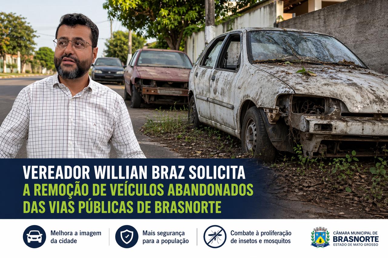 Preocupado com a organização urbana, a segurança da população e a saúde pública, o vereador Willian Braz apresentou uma indicação ao Poder Executivo Municipal solicitando a identificação, notificação e remoção de veículos em estado de abandono ou desuso nas vias públicas da cidade.